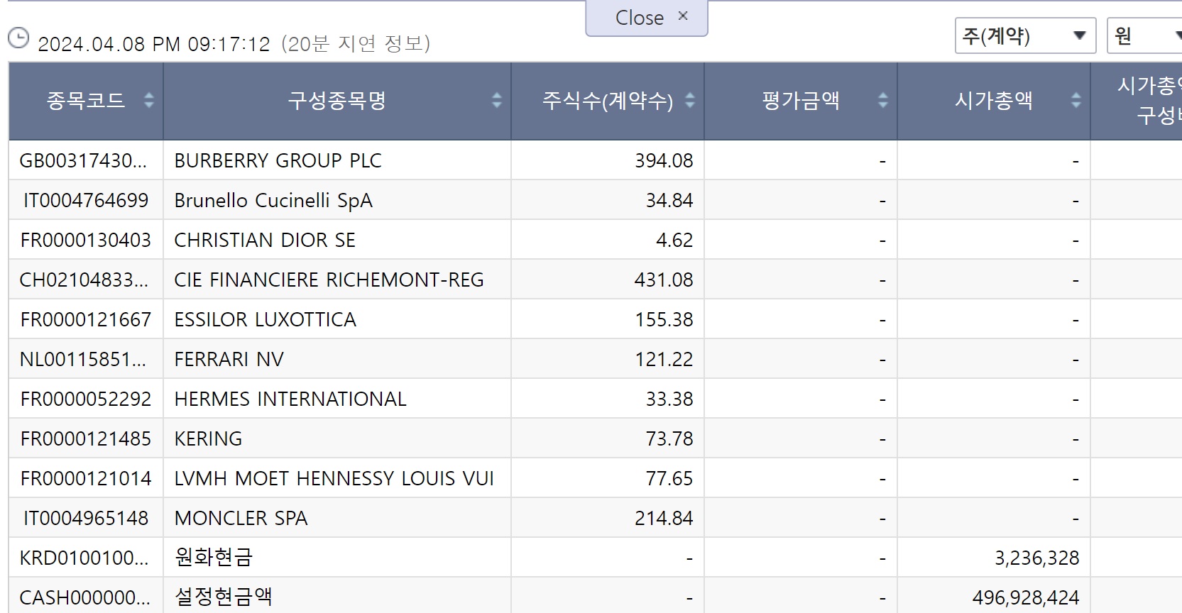 10개 종족이라지만 상위 7개 종목에 90% 이상의 비중을 가져가고 있습니다. 집중되는 점이 만족스러운 면입니다. 올 들어 에르메스 계열사 LVHM의 주가상승률은 연초대비 13%를 넘어서고 있습니다. 시총은 592조 정도 되는 회사입니다.
