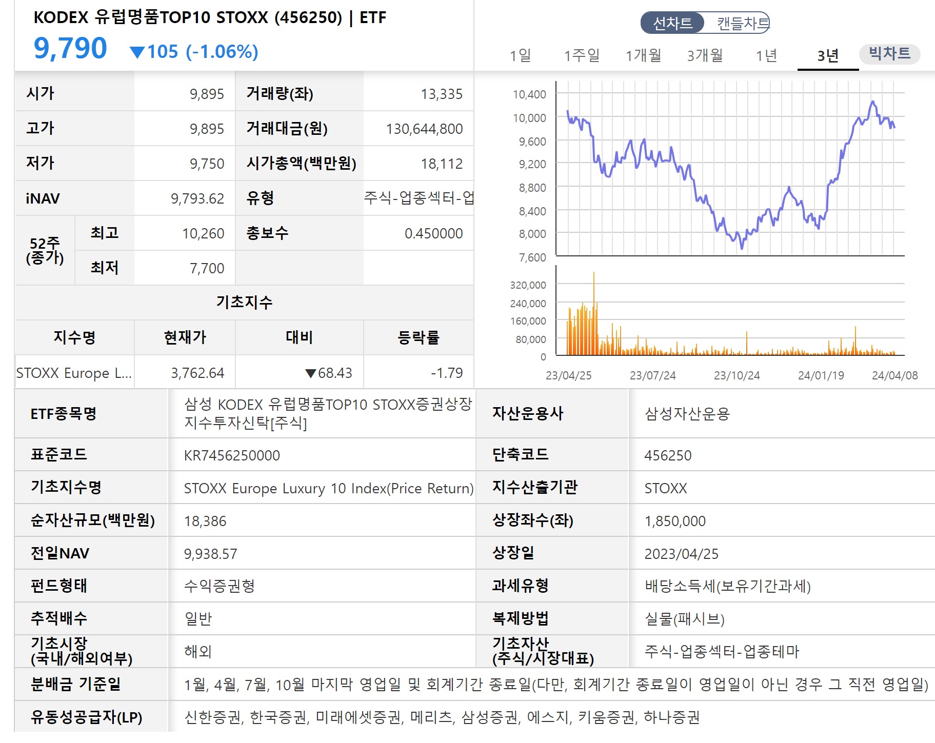 지수대비 수익률, 벤치대비 성과도 높은 편입니다. 올 들어 국내지수는 3.85% 상승에 그친반면, KODEX 유럽명품 TOP10 STOXX ETF는 16.55% 상승하였습니다. 아쉬운 점은 거래 시 호가당 4천만 정도인 점이 조금 아쉬운 면입니다만 분기별 분배금을 배당하고 있는 점이 매력이기에 권장되는 ETF라 할 수 있습니다.