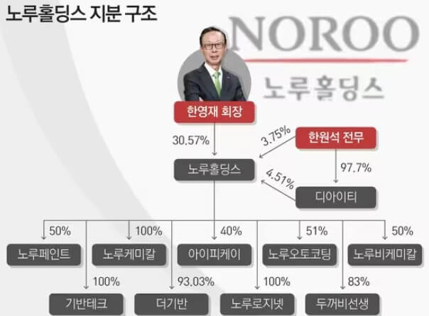 따라서 3대 후계자인 한 부사장 소유의 디아이티(100%)→노루알앤씨 계열의 가치는 현 노루홀딩스 회장으로부터 향후 증여 등을 통해 지분을 넘겨받을 때 증여세 등 재원을 마련하거나 지배기반을 다지는 데 사용될 수 있으리라 보입니다.