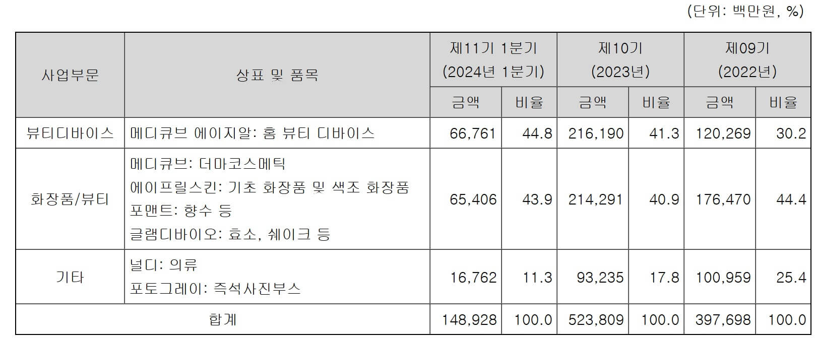 화장품 부분은 메디 큐브(더마코스메틱), 에이프릴스킨(고기능 저자극 피부설루션), 포맨트(라이프스타일 뷰티) 등의