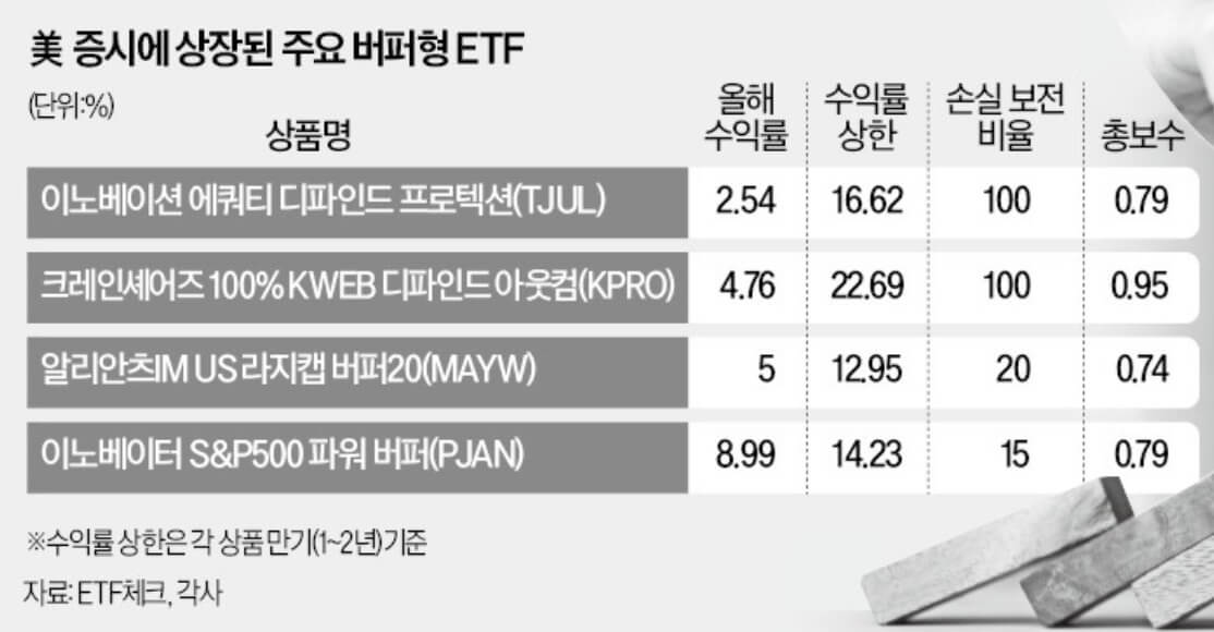 미국에 상장된 버퍼형 ETF에 순자산이 50조가 몰렸습니다. 대내외적인 불확실성 커지자 뭉칫돈 몰린 것으로 보입니다.