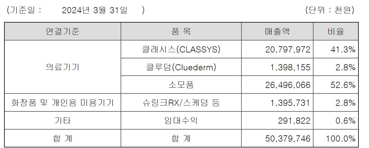 공시서류 작성기준일 현재 클래시스 브랜드와 소모품의 매출비중은 각각 41%와 53%입니다.(24년 5월14일 분기보고서 기준입니다.)