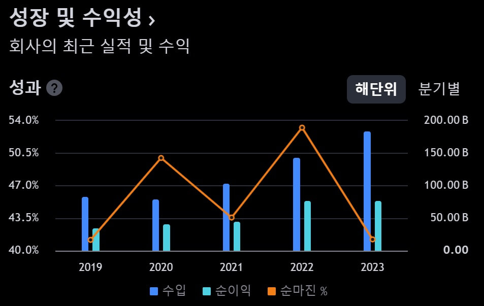 성장성이 열려있다 볼 수 있습니다만 수익성을 연간 분기로 바라보면 성장성이 약화되고 있는 점을 볼 수 있으며, 또한 대외적 환경 변화 시 이익에 민감해질 수 있는 시기가 발생할 수 있습니다.