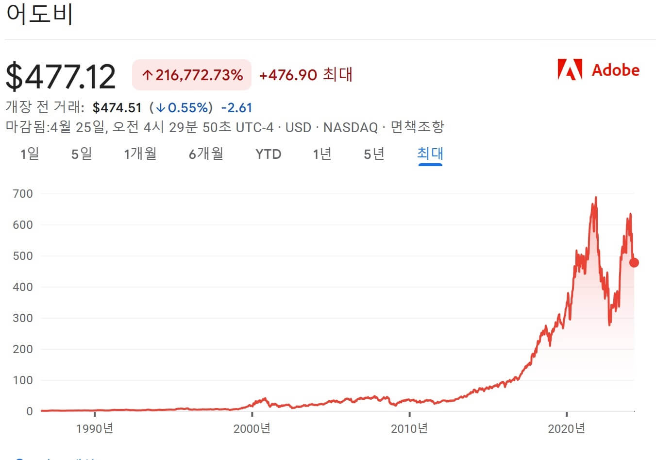기업코드 ADBE, 미국 나스닥에 상장되어 있으며, 2012년 구독 모델로 전환 후 팬데믹 전까지 10배 이상의 주가상승을 보였습니다. 최고가 시절엔 구독모델 전환대비전년도 주가 기준 20배를 달성하기도 했습니다.