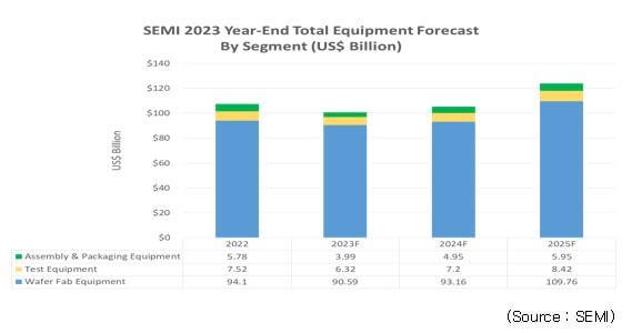 글로벌 반도체 장비시장은 2023년 약 $ 900억으로 2022년 대비 6~10% 정도 하락할 것으로 예상되나, 2024년은 2023년 대비 15% 정도 증가 한 $ 1,070~1,080억 수준이 될 것으로 보입니다. 메모리 테스트 장비 시장에 대해선 구체적이고 공신력 있는 예상치가 세분화되어 발표되어 있지 않으나, 글로벌 테스트 장비 시장은 Advantest와 Teradyne이 약 70~80%를 점유하고 있습니다.