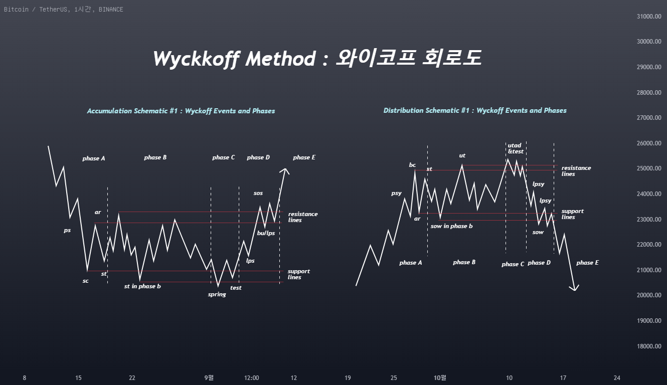 와이코프(Wyckoff) 패턴은 트레이더와 투자자들을 위해 개발된 투자 원칙과 전략으로 구성된 방법입니다. 이 방법은 1930년대 초반에 리처드 와이코프가 개발했습니다. 와이코프 패턴은 주로 공급과 수요의 법칙을 기반으로 합니다.