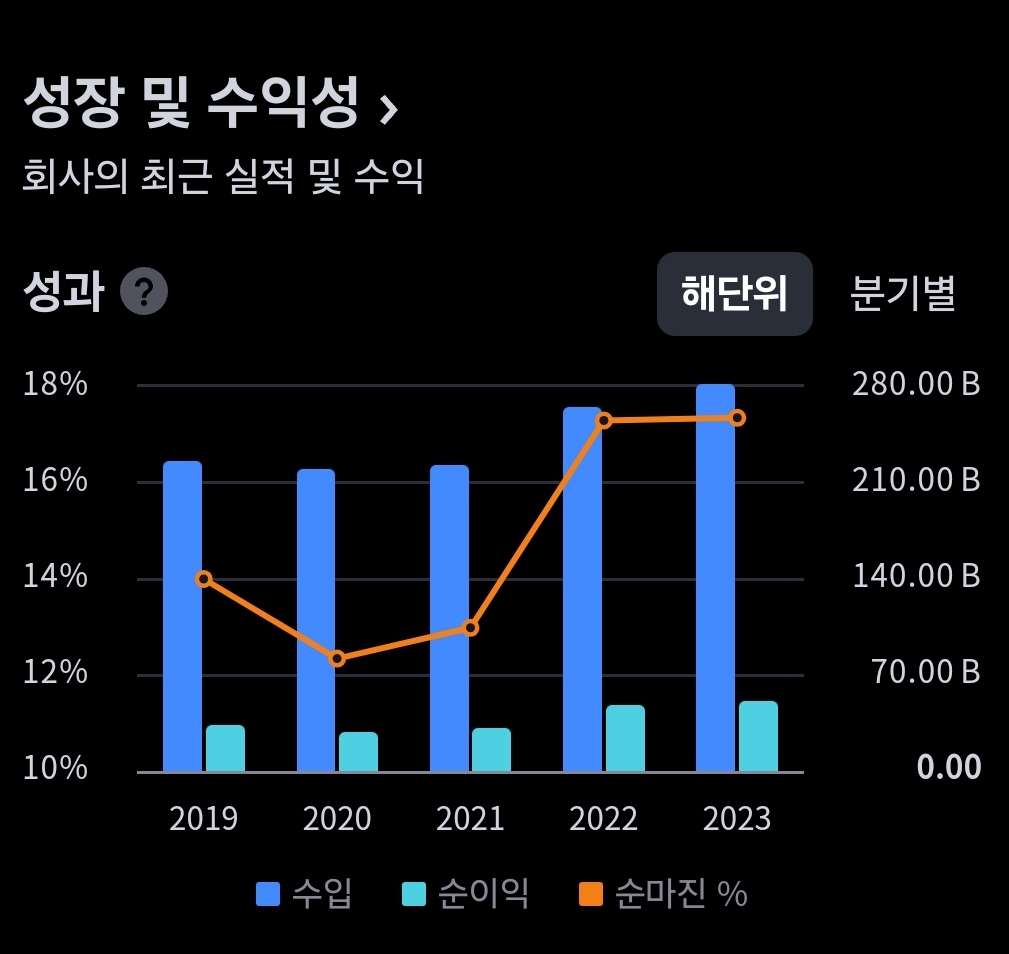 매출액상승률 8~9.5%(연간기준)이며 , 자본총계상승률 연간 8.9% 정도 됩니다. DPS 1.7% 420원으로 배당성향은 높지 않으며 배당으로 돌리기보단 연구 개발 쪽으로 자본배치되고 있다고 보입니다.