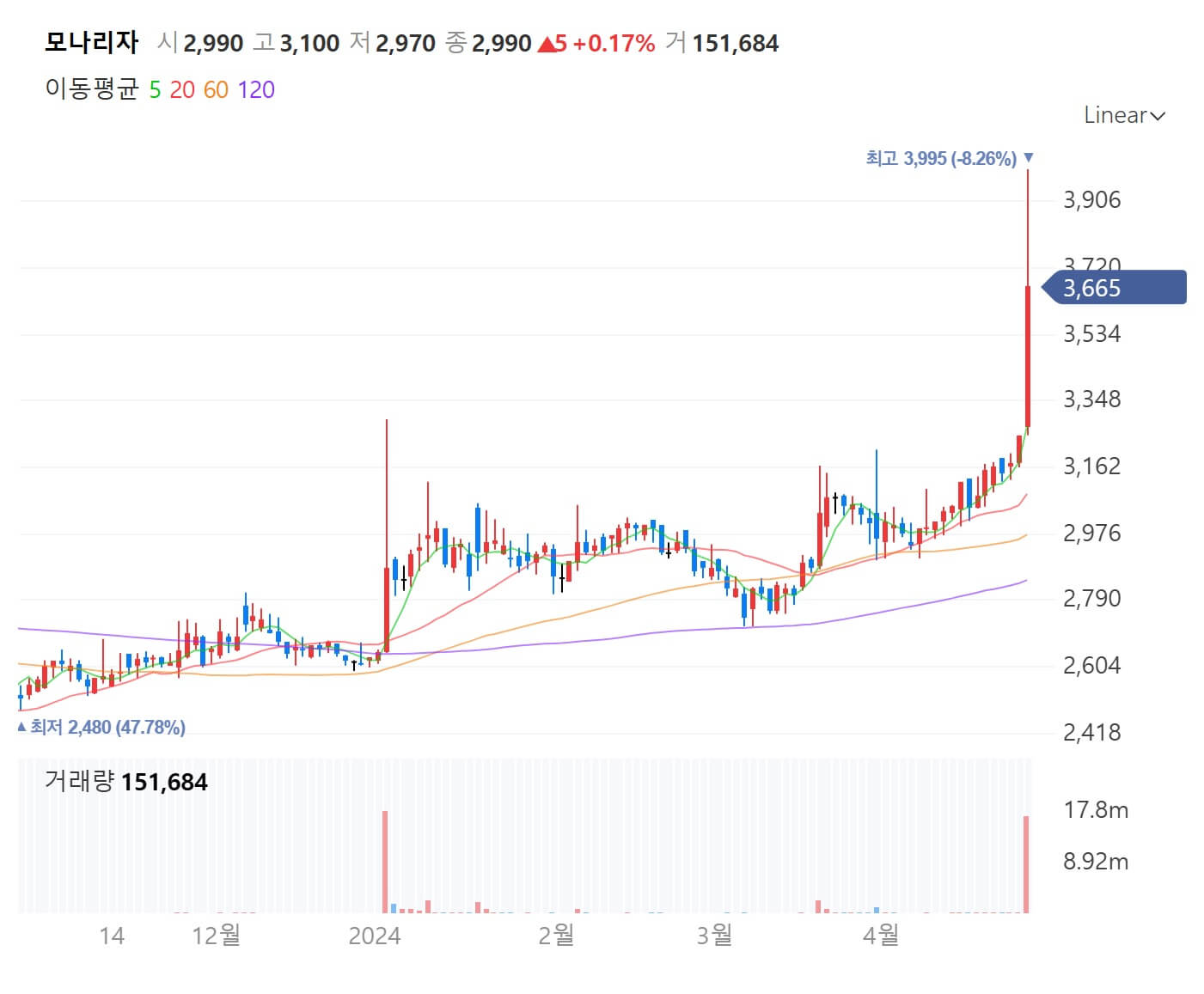 모나리자는 24. 4. 25일 지수하락에도 12.94%의 상승을 보였습니다. 이유는 4000억 매각설 이 근거입니다. 왜 오르는지에 대한 이유는 참고로 알아두고 접근하는 것을 권장드립니다. 전체적인 지수가 하락 시에 상승을 보이는 종목은 힘 있는 종목으로 분류되는 편입니다.