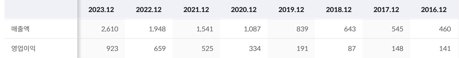 매출은 최근 10년간 2014년 200억대 매출에서 23년기말기준 2600억 원 상당으로 성장하였습니다. 연평균으로 약 25%의 성장률을 보입니다.