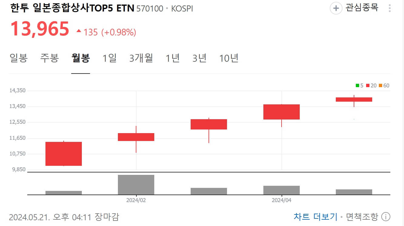 24년 1월 4일 상장 후 이날까지 38%의 수익률을 보이고 있습니다. 버핏이 투자한 일본종합상사에 투자하고 있는 ETN은 한국투자증권에서 거래 하실 수 있습니다. '한투 일본종합상사 TOP5 ETN'은 24년 5월 21일 기준 1만 3965원으로 마감되었습니다.