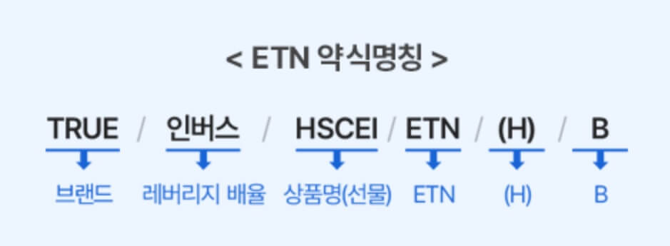 ETN 약식명칭에서는 발행 증권사의 명칭은 없이 간략하게 브랜드만을 표기합니다. 상품의 핵심내용으로 정식명칭과 동일하거나 유사하게 표기합니다. 예시로든 이 종목은 TRUE 인버스 HSCEI ETN(H) (570007)이 2018년 6월 만기가 도래됨에 따라 본 상품과 기초지수 및 구조가 동일하되 만기만 연장된 TRUE 인버스 HSCEI ETN(H) B (570028)를 2018년 6월에 신규 상장한 것으로 기존 상품과 구분을 두기 위해 종목명 끝에 ‘B’를 표시한 것입니다.