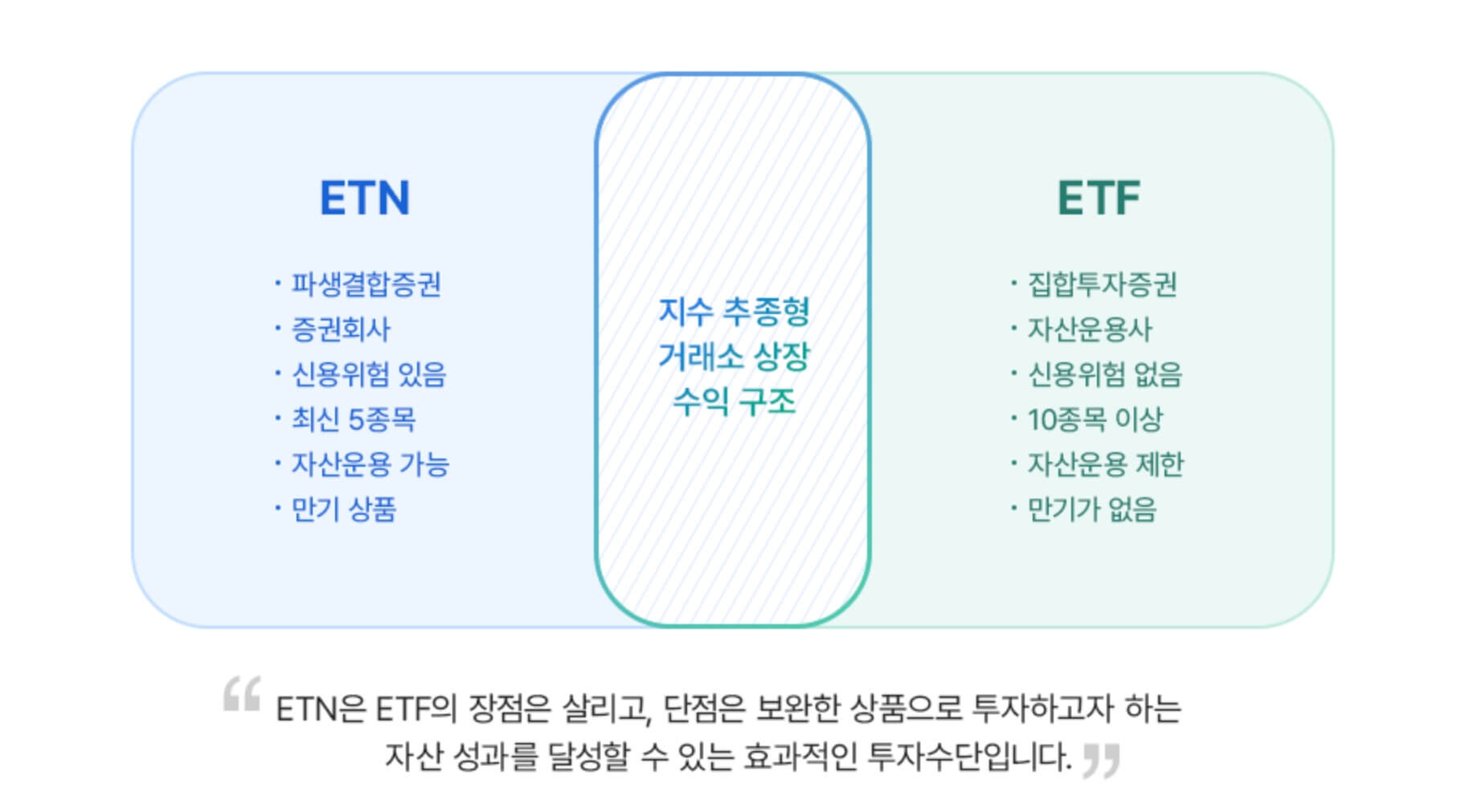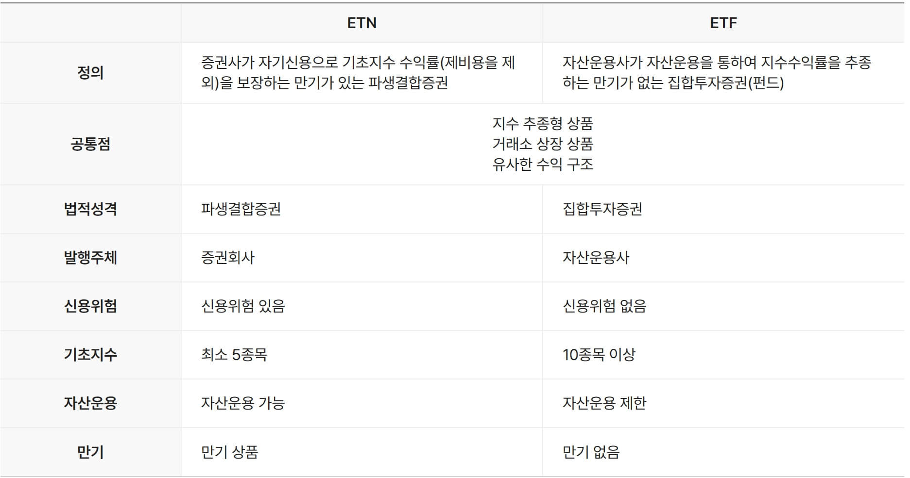 ETN과 ETF의 비교를 한눈에 보도록 하겠습니다.