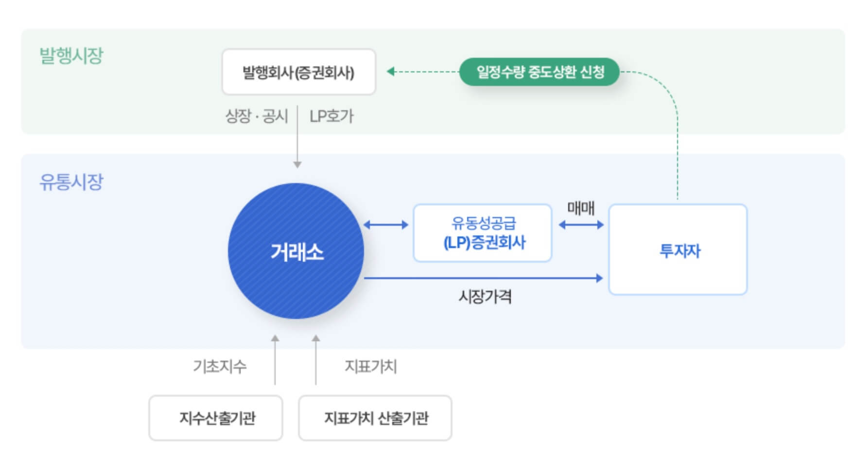 거래소는 투자자 보호를 위하여 ETN 시장 적합성을 심사하고 원활한 유동성 공급을 위해 LP를 평가 관리하며, ETN 시장가격에 대한 모니터링 및 시장조치 업무를 수행합니다. 투자자는 증권회사 계좌를 통해 거래소 시장에서 형성된 시장가격으로 ETN을 실시간 매매할 수 있으며, 경우에 따라 거래소를 통하지 않고 발행증권사에 일정 수량 이상 중도상환을 신청할 수도 있습니다.