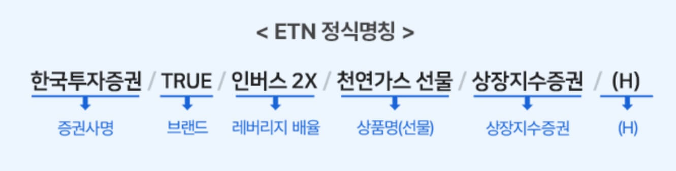 ETN 종목명으로부터 발행 증권사, 추종하는 지수(기초자산, 전략, 선물지수 여부 등), 레버리지 배율, 상품 특징 및 환헤지 여부를 알 수 있습니다. ETN 종목명은 기초지수의 전략, 기초자산 또는 지수명과 일관성이 있고, 레버리지 배율 등을 알 수 있어야 하며, 환헤지 상품은 (H), 선물지수인 경우 ‘선물’ 이 포함됩니다.