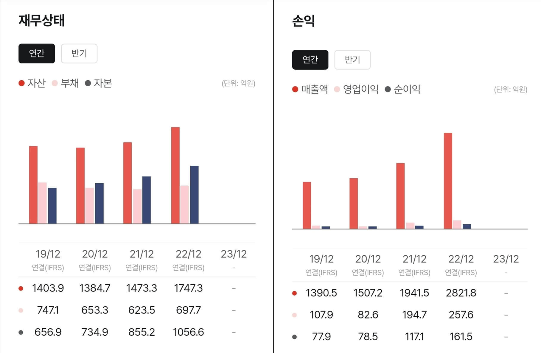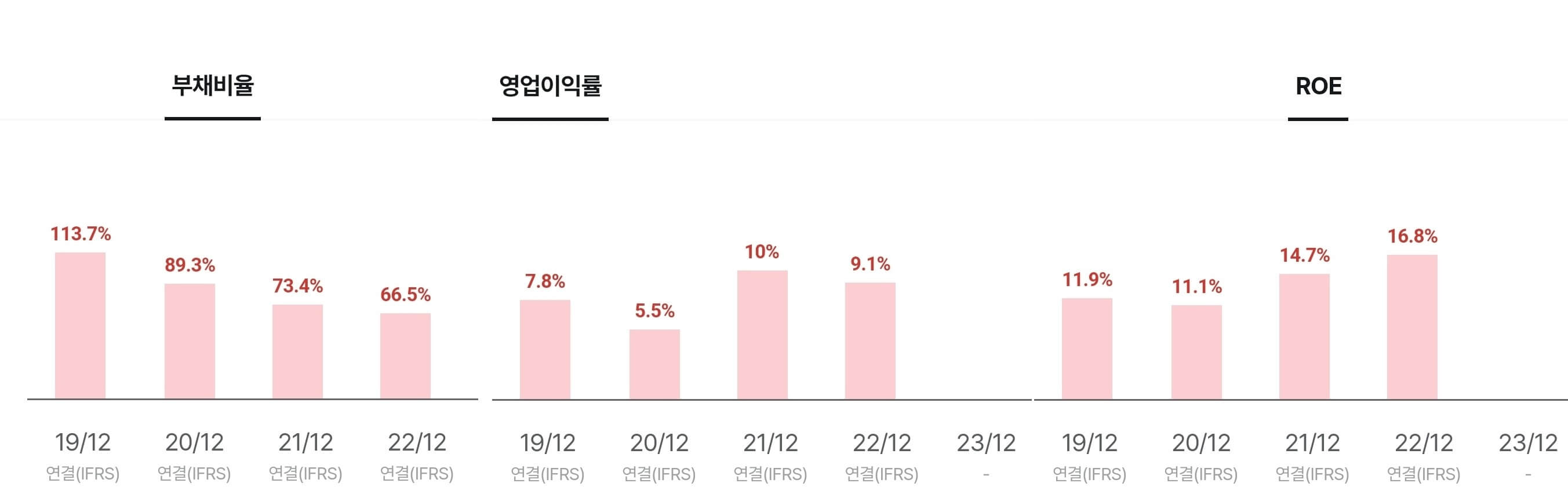매출이 45.5% 신장 한 반면 영업이익은 별차이 없는 점은 배달 쪽 이익감소 및 원자재가격 상승이 어느 정도 반영되었다고 볼 수 있겠습니다 23년 기준 매출액 대비 영업이익률은 6.2% 정도입니다.