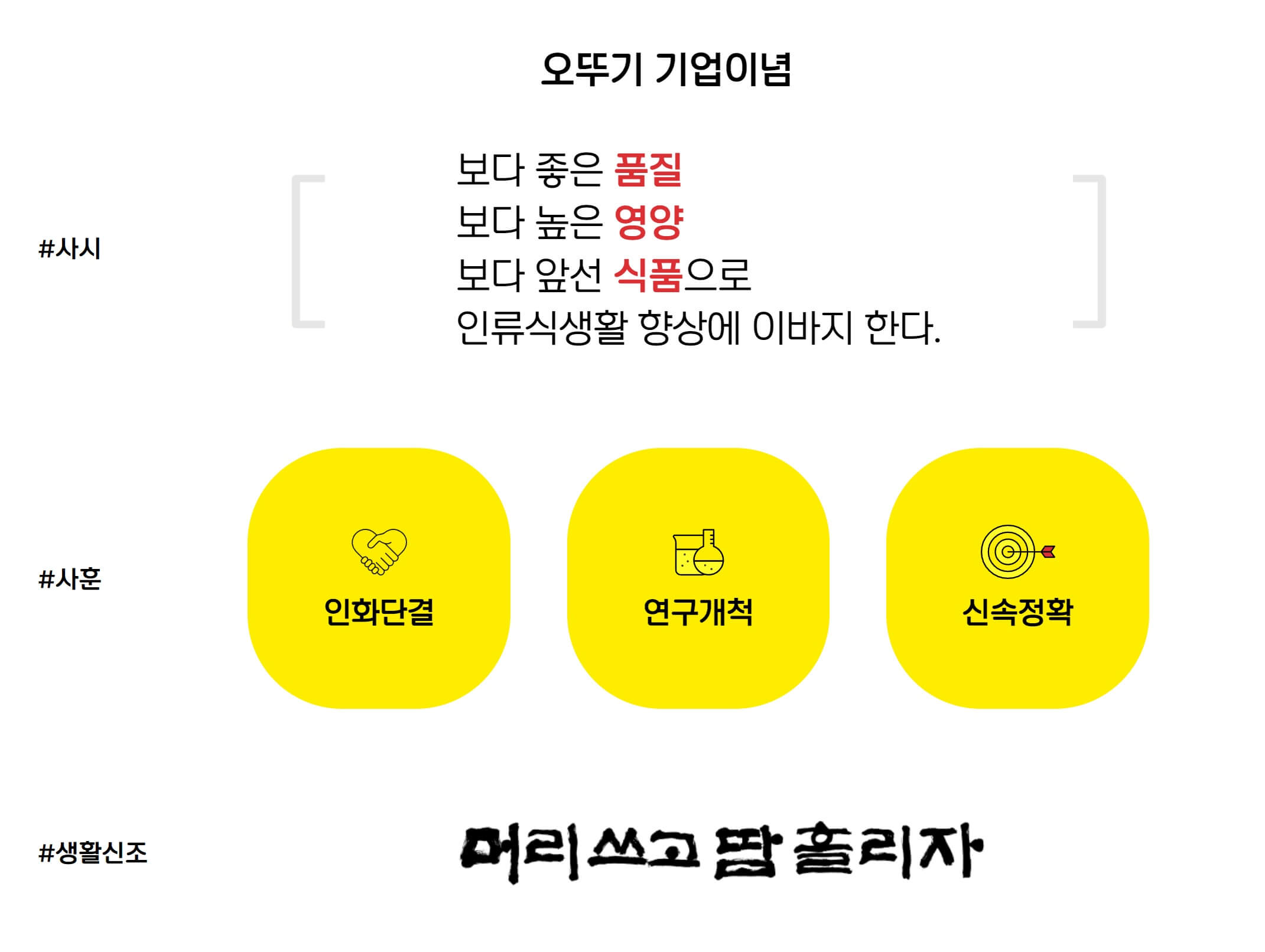 매출활성화와 브랜드 가치 향상을 위해 오뚜기의 제품과 브랜드를 긍정적으로 경험할 수 있도록 "롤리폴리 꼬또", "오키친스튜디오"와 같은 브랜드 경험 공간을 운영하면서 고객과 직접적인 커뮤니케이션을 확대해가고 있으나 성과는 미미합니다. 다양성에 맞춰진 전략 부분이 개선이 필요해 보입니다. 타겟층을 명확히 하지 못하는 부분에서 기대효용은 떨어지는 것으로 판단됩니다.