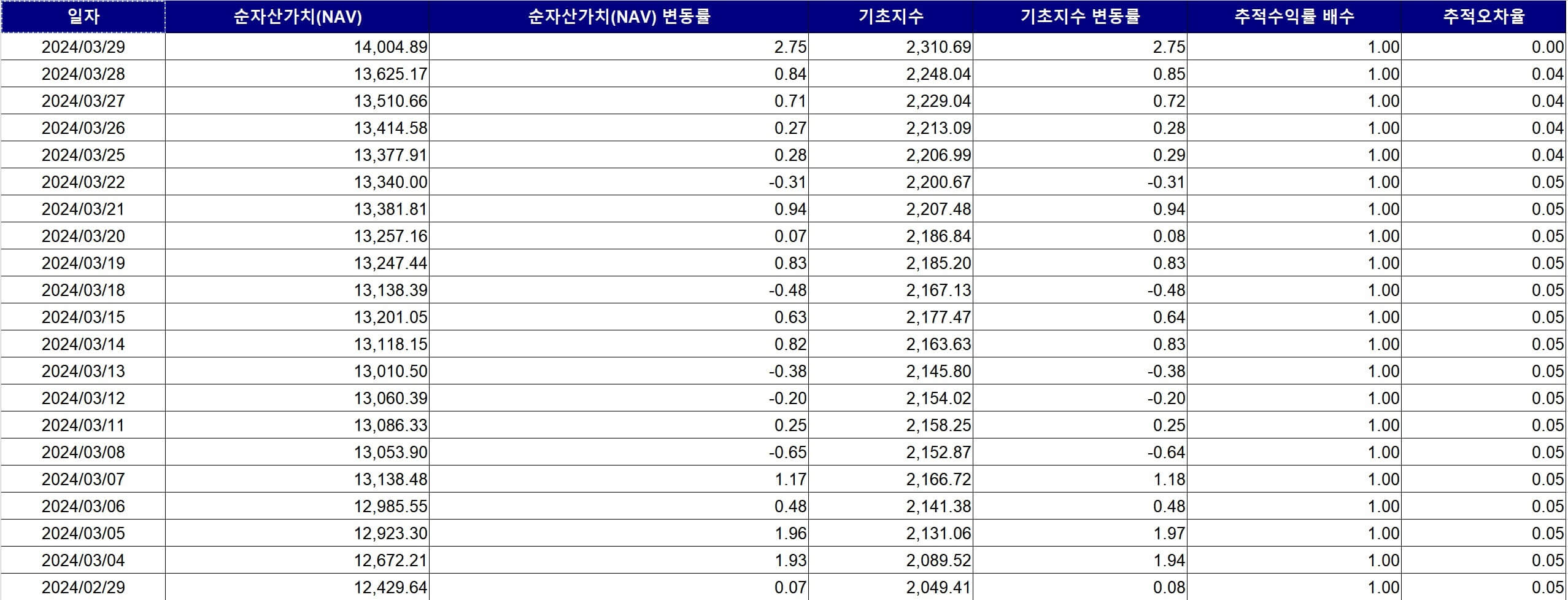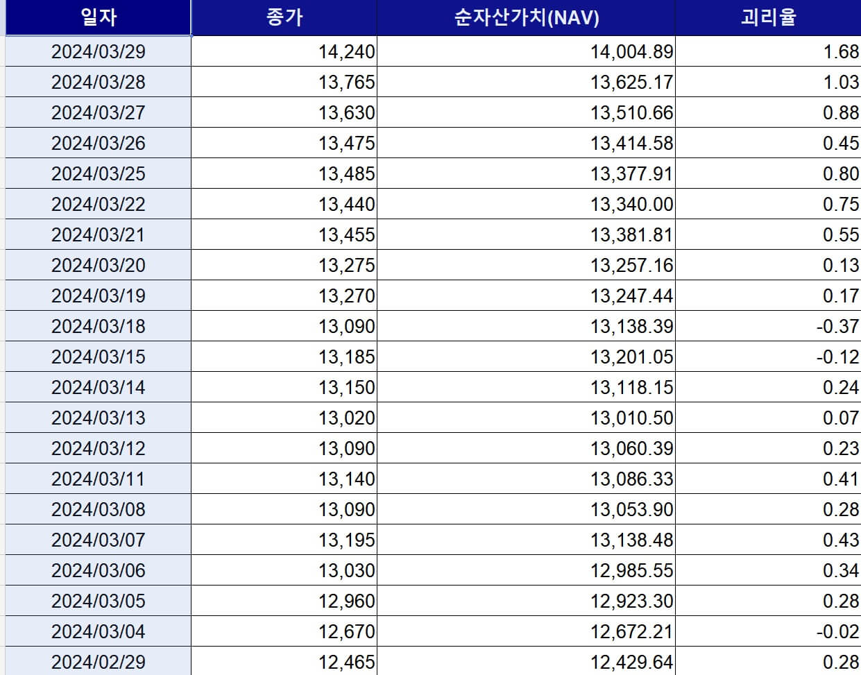 ETF의 가격은 NAV와 시장 가격의 차이, 즉 괴리율에 의해 영향을 받습니다. 괴리율이 낮을수록 ETF가 순자산가치에 가깝게 거래되고 있다는 것을 의미하며, 이는 다른 ETF에 투자 시에도 참고하면 좋습니다. 또한, 추적오차는 ETF가 추종하는 기초지수와의 성과 차이를 나타내며, 추적오차율이 낮을수록 ETF가 해당 지수를 잘 따라가고 있다는 것을 의미합니다.