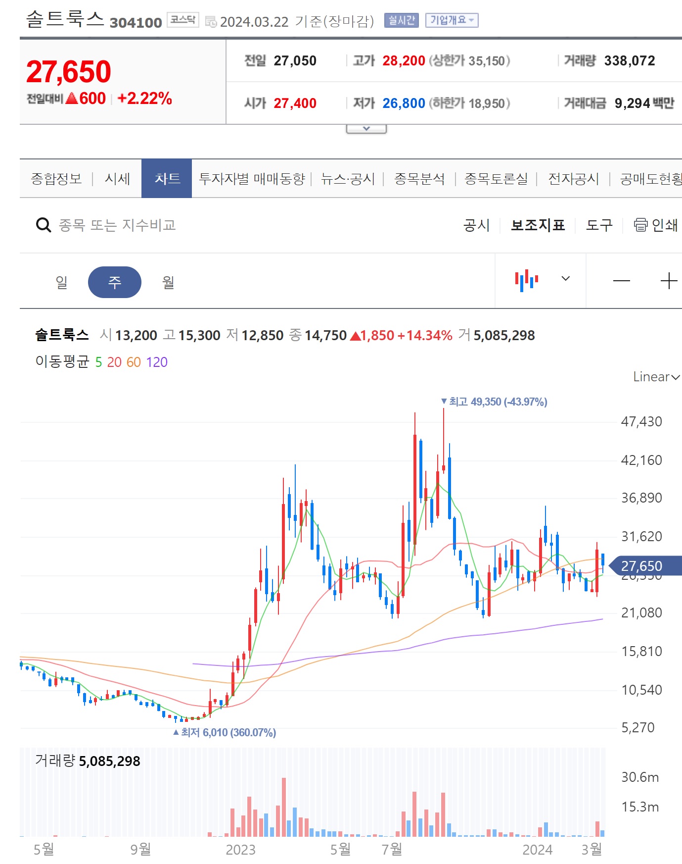 2020년 이후로 순이익이 급감하고 있으며 영업이익은 22년에 반짝 상승했으나 이후 내리막을 거하게 타고 있습니다. 꾸준한 매출이 그나마 강점이지만 순이익은 급락중입니다. 영업이익 부분도 스키장 최상급자 코스처럼 내리막을 타고 있습니다. 월간거래량이 특히 늘거나 하진 않았습니다. 최근 6개월간 외인과 기관의 매도량이 매수량보다 많습니다. 현 주가는 완연한 고평가로 보입니다. 시장의 ai시대트렌드에 대한 과한 기대감으로 인한 상승이라 판단됩니다. 길게 가져 갈 기업이 아니기에 자세한 분석은 생략하겠습니다.